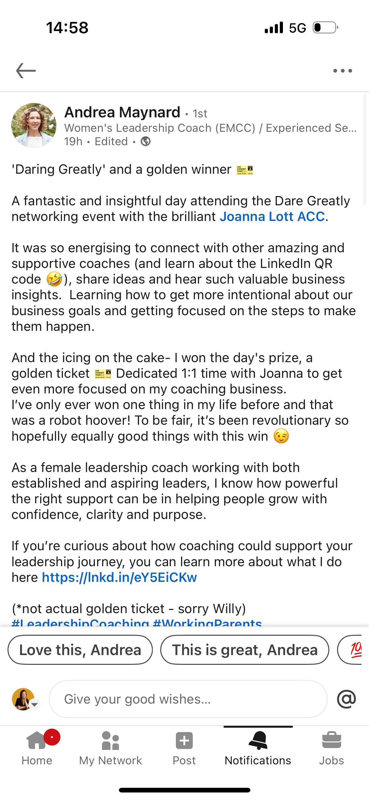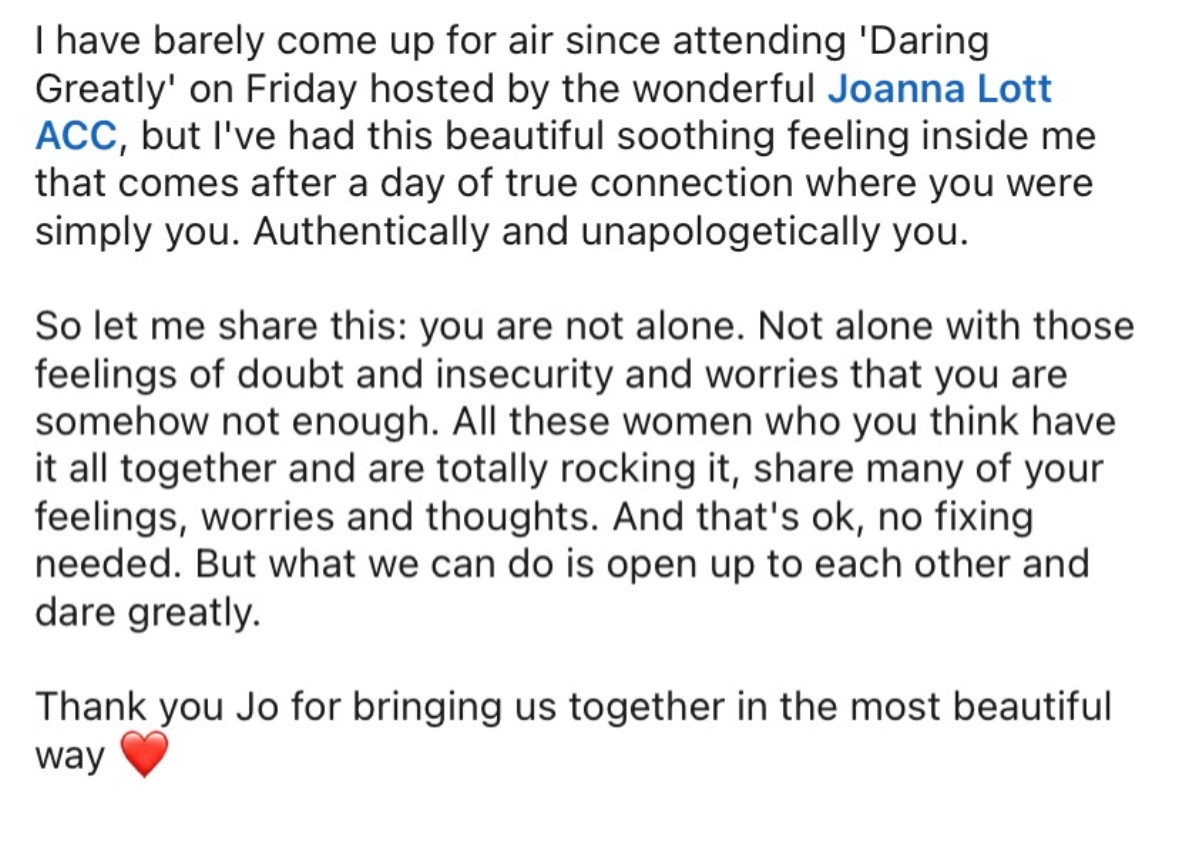 I’d still love you to be part of Dare Greatly. While many people travel — we’ve had coaches join from as far as Spain, Manchester, and Wales — I’m also running a live online workshop the following week. It’s a shorter but equally powerful session where you’ll work through the Dare Greatly Planner from home, with your materials and goodies posted to you.