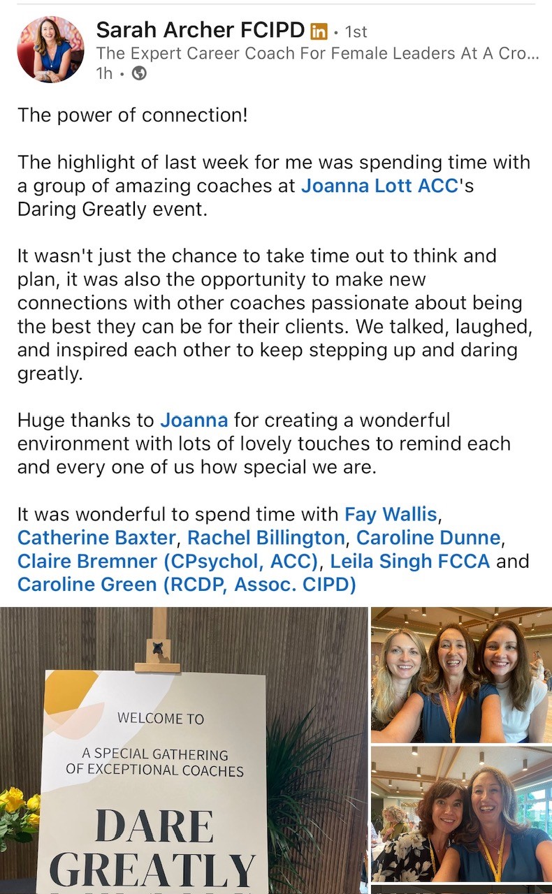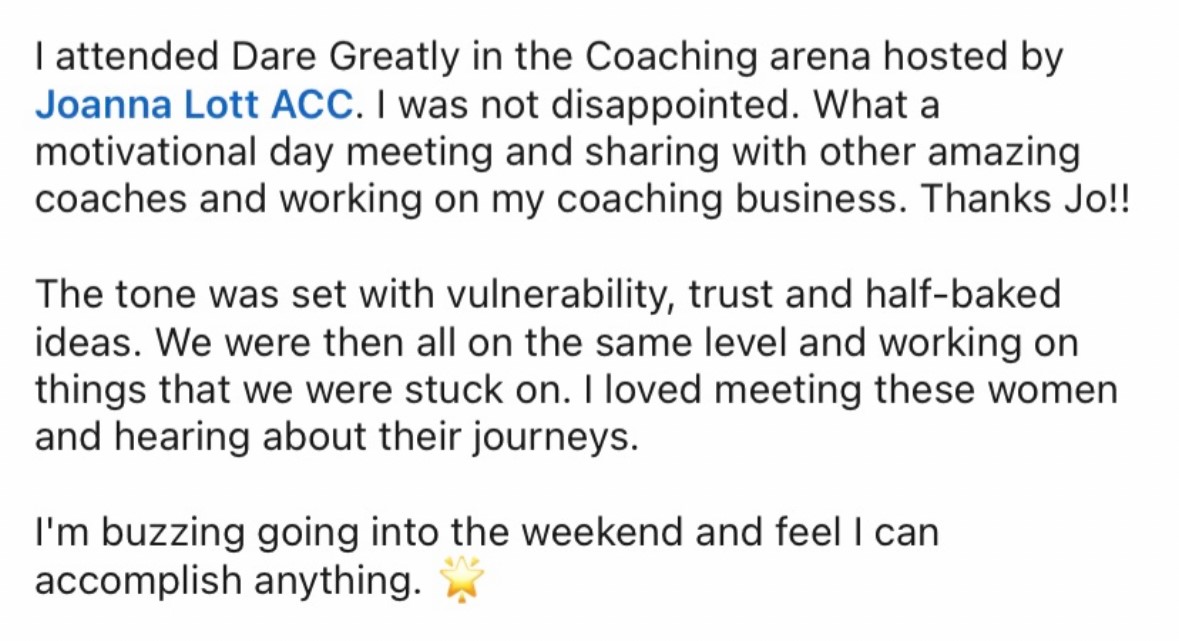 Dare Greatly is for coaches who want to grow their business with honesty, structure, and purpose. The day attracts a mix of career, executive, leadership, and business coaches — some newer, some more established — all with the shared goal of running sustainable, fulfilling businesses.